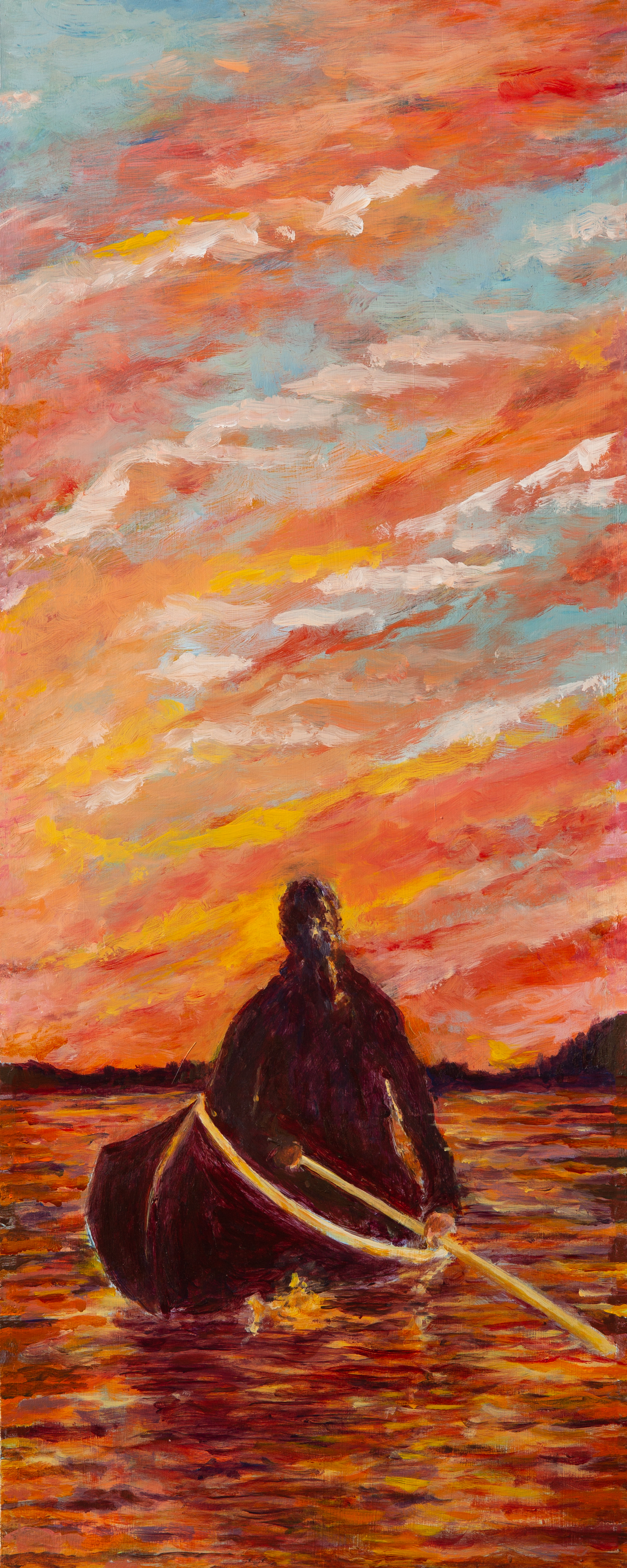 Tom on Smoke Lake is a rendering of the original oil painting by Tom Thomson. I painted him canoeing in the 1915 painting Smoke Lake.