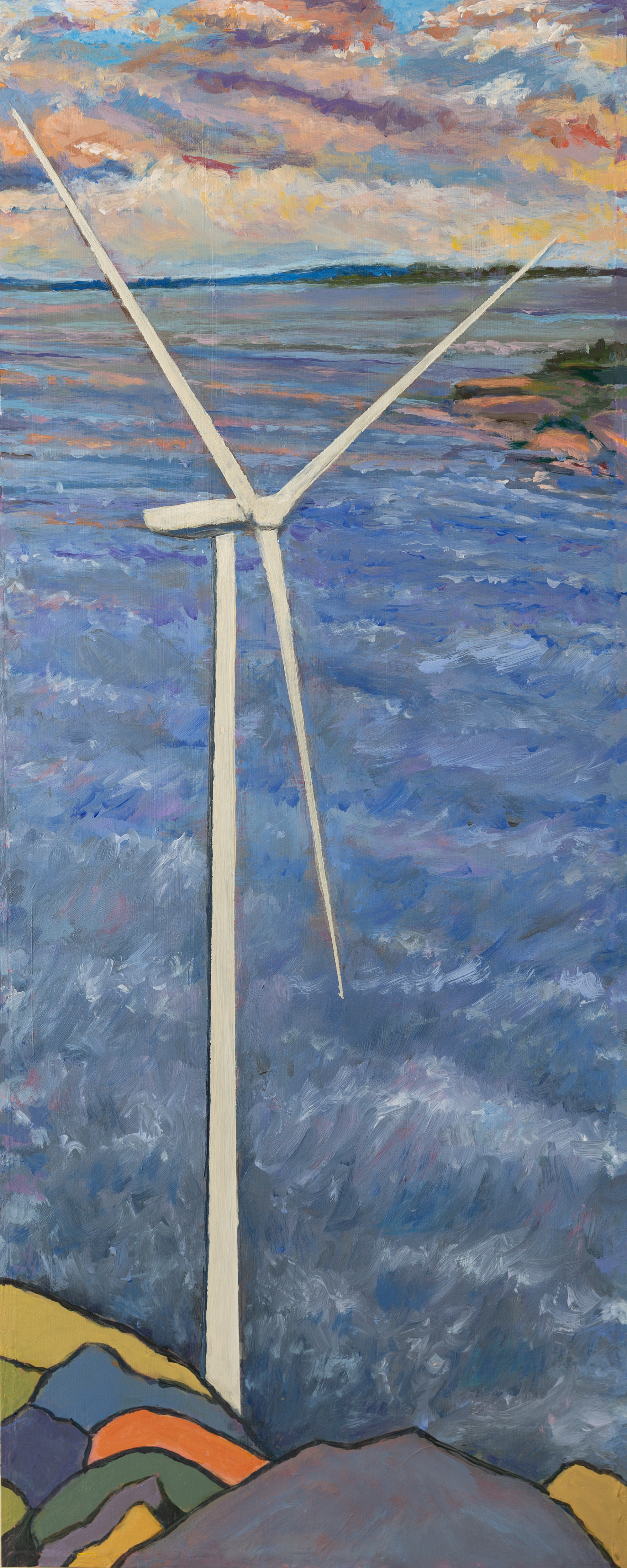 Harness the Wind celebrates Pickering’s green energy innovations. The painting depicts the enormous wind turbine that stood on the shore of Lake Ontario adjacent to the Nuclear Generating Station. The turbine replaced Varley’s windblown pine, painted in Stormy Weather in 1927.