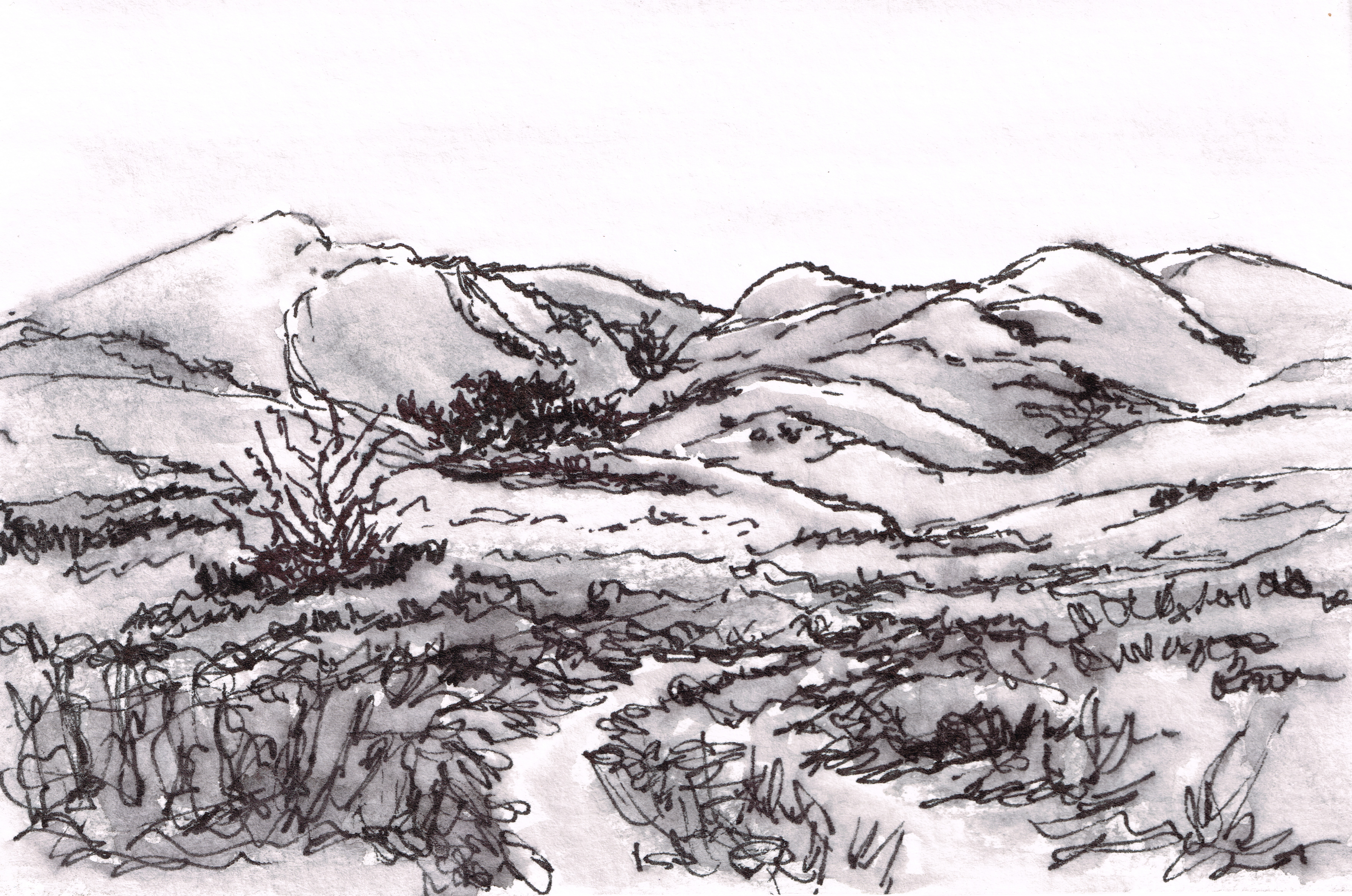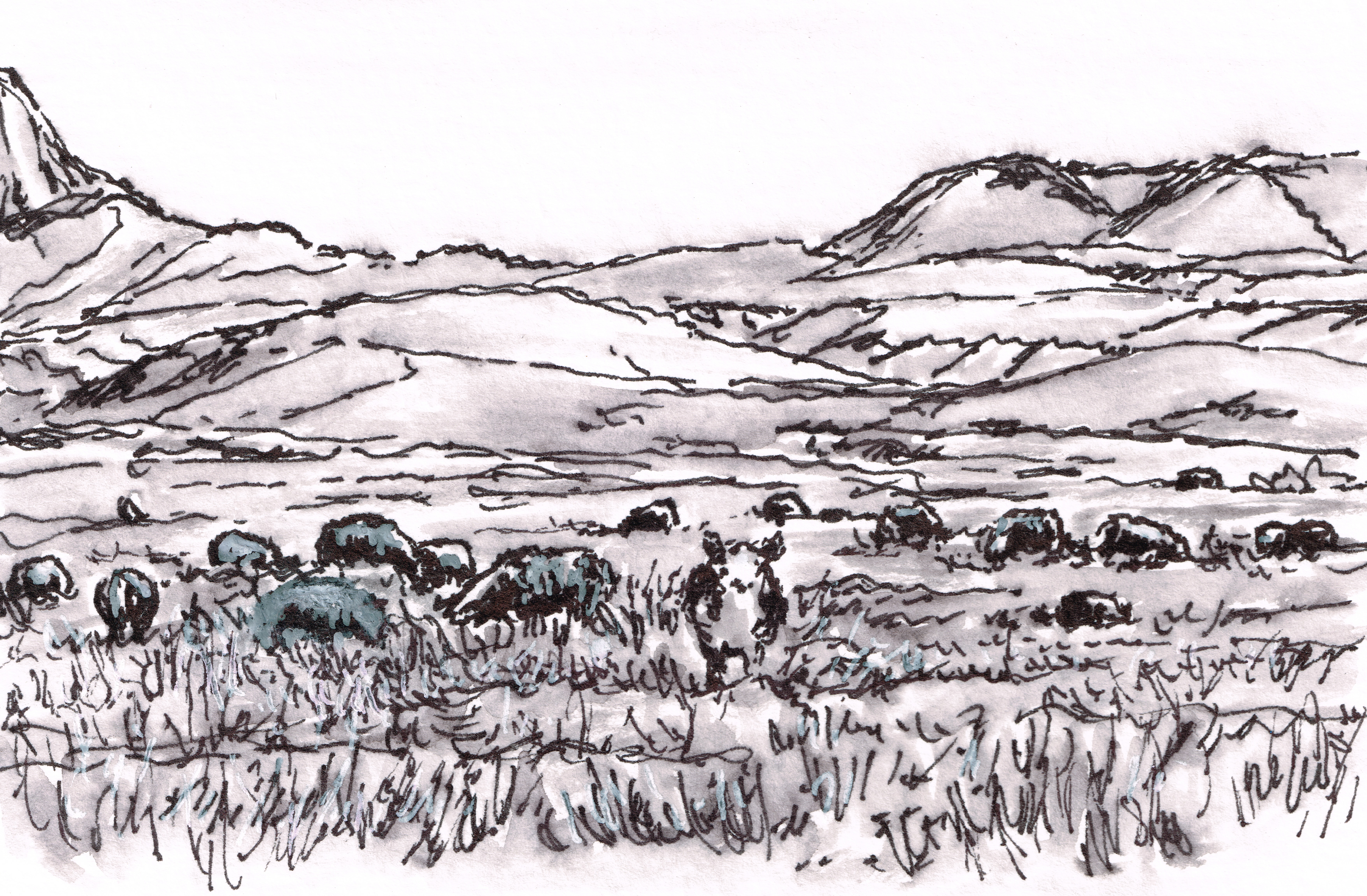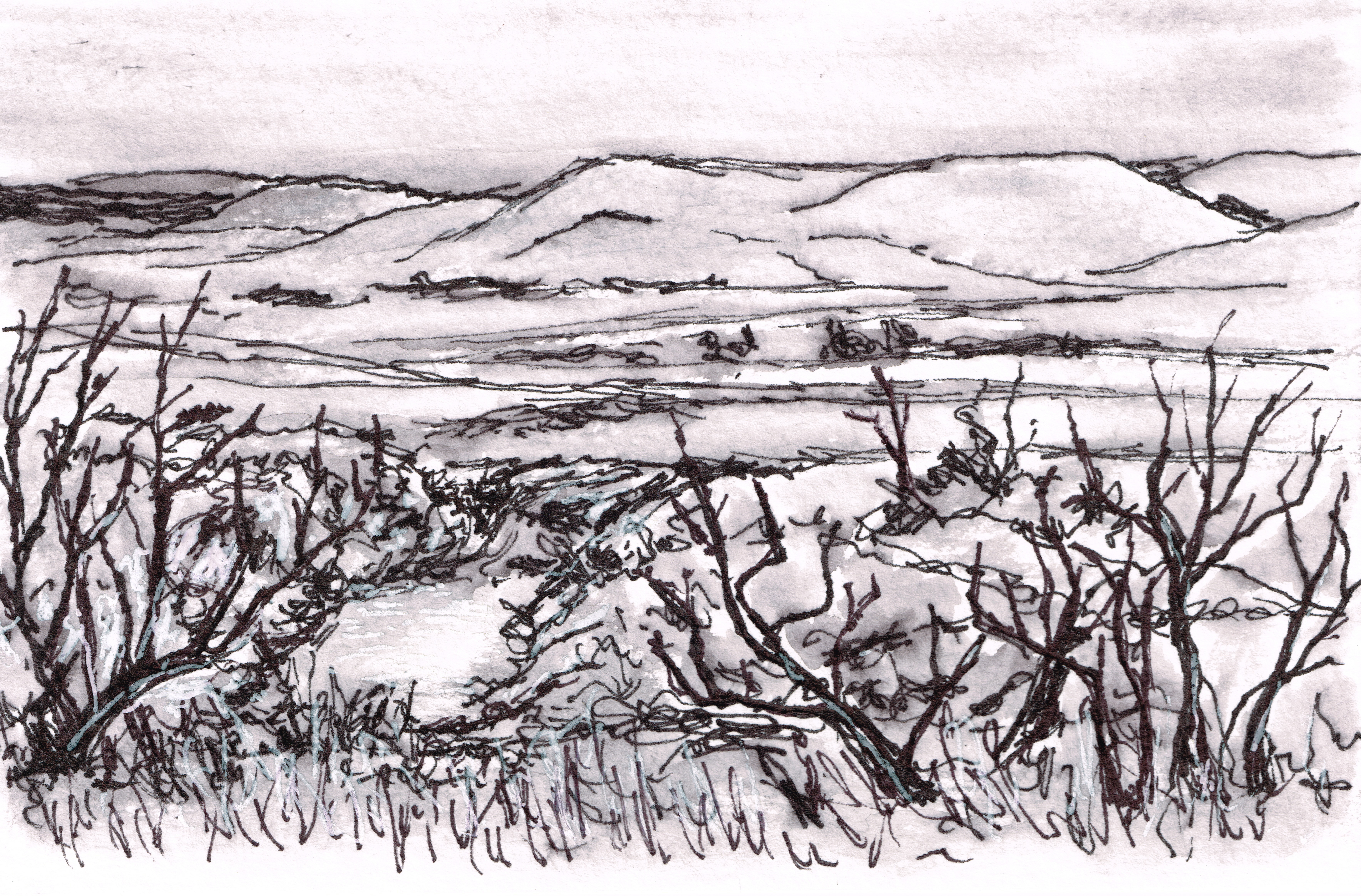 I drew numerous small sketches while taking daily walks in Grasslands National Park. This was an exercise in understanding the land and my relationship to it. Through the act of walking, I found much needed tranquillity and I meditated.